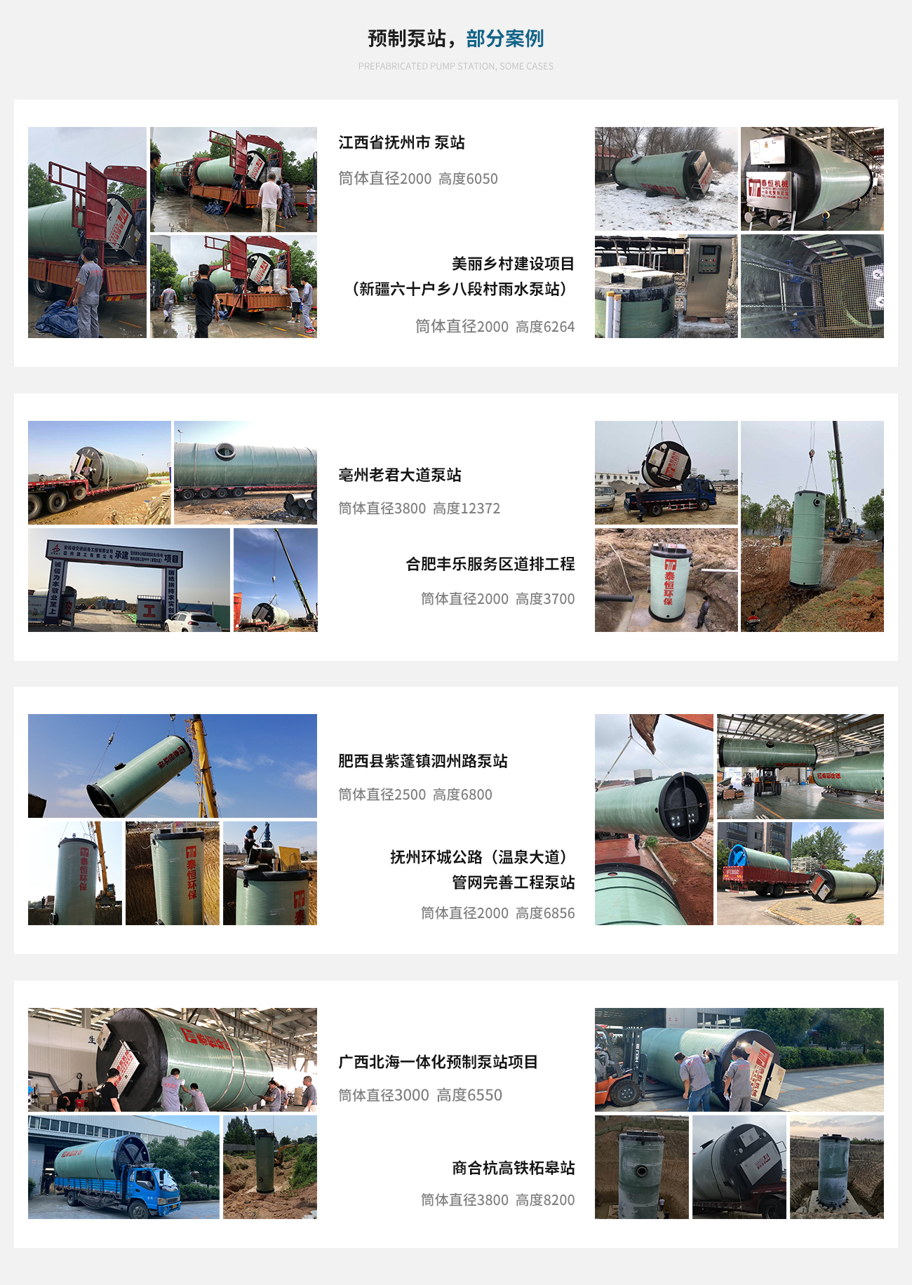 一體化預制泵站是替代老式排水泵站的理想解決方案,是集成式一體化預制泵站。一體化預制泵站為交鑰匙工程,該泵站的筒體采用先進的加厚型中等密度的玻璃鋼材質制成的。內部的水泵、管路、閥門、儀表、控制設備以及其它用戶所需要的附件成套提供,并安裝完畢后出廠。是一種使用方便,質量專業,土建工作少,成本較低的新型一體化泵站設備,容積優化是其顯著的特征。廣泛應用于市政工程、工業或其他一切不能依靠重力作用直接把廢水排放到污水處理系統的建筑。其中,市政排水適用于污水泵站、排水泵站、合流泵站等中途泵站。